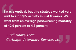 "I was skeptical, but this strategy worked very well to stop the SIV activity. It eliminated coughing pigs, improved gilt health post-arrival and drastically improved overall pig quality in just 8 weeks," says Hollis."We went from an average post-weaning mortality of 12.6 percent to 4.4 percent."